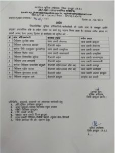 झाबुआ…झाबुआ जिले में पुलिस विभाग में एक बार फिर बड़ा फेरबदल किया गया हैं। पुलिस अधीक्षक अगम जेन के निर्देशानुसार थाना प्रभारियों को इधर से उधर किया गया हैं। थाना प्रभारी मेघनगर के पद पर पदस्थ तुरसिंह डावर को झाबुआ थाना प्रभारी बनाया गया, डीआरपी लाइन से रमेश चंद्र भास्करे को थाना प्रभारी मेघनगर,थाना प्रभारी रायपुरिया राजकुमार कोसारिया को थाना प्रभारी थांदला,थाना प्रभारी काकनवानी दिनेश रावत को रायपुरिया, डीआरपी लाइन से निर्भय सिंह भूरिया को थाना प्रभारी कल्याणपुरा,तारा मंडलोई को थाना प्रभारी काकनवानी, शंकर सिंह रघुवंशी को थाना प्रभारी राणापुर, प्रदीप वाल्टर को थाना प्रभारी कालीदेवी, कुंवर लाल बरकड़े को थाना प्रभारी अजाक झाबुआ और नानूराम वर्मा को कंट्रोल रूम प्रभारी बनाया हैं।