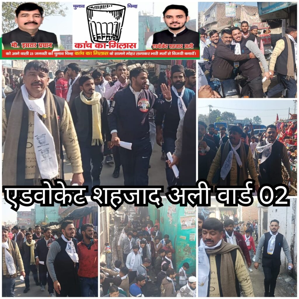 नगर पंचायत भगवानपुर वार्ड नंबर 2 में धुवा धार चुनाव प्रचार से विरोधी प्रत्याशियों में खलबली माचा दी बरहाल चुनाव के समीकरण कुछ भी हो सभासद प्रत्याशी इम्तियाजी के पक्ष में इसरार प्रधान ने सियासी सूरमाओं की टेंशन बढ़ा दी इस बार जीत पक्की। इसरार प्रधान ने वार्ड के नगर वासियों से ज्यादा से ज्यादा वोट की अपील की, कहा में तुम्हारा सेवक हूं और सेवक बनकर ही रहूंग, आने वाली 23 जनवरी को गिलास के निशान पर मोहर लगाकर विजय बनाएं। इम्तियाजी सभासद प्रत्याशी को जनता का भरपूर समर्थन मिल रहा है जिससे विरोधी प्रत्याशियों की उड़ी नींद लोगों को कहना इस बार एडवोकेट शहजाद अली की माताजी इम्तियाजी विजय बनाना है। एडवोकेट शहजाद अली ने चुनाव जनसंपर्क तेज कर ज्यादा से ज्यादा वोट की अपील की। उन्होंने विपक्षी प्रत्याशी द्वारा किए जा रहे वादों को जुमला बताते हुए उनसे बचने की अपील की कहा कि क्षेत्र में जो भी समस्याएं हैं वह उन्हें भली भांति जानते है जल्द ही उन समस्याओं का समाधान करेंगे इसीलिए चुनावी मैदान में आए हैं। उन्होंने कहा कि आज विपक्षी प्रत्याशी बड़े बड़े वादे और दावे कर रहे हैं वह केवल जुमला हैं। एडवोकेट शहजाद अली ने कहा जनता का समर्थन और उनका प्यार उनके लिए मजबूत ताकत और जीत है लोगों का कहना है कि इम्तियाजी को नगर पंचायत वार्ड तीन का सभासद बनाएंगे इस बार बदलाव जरूरी।