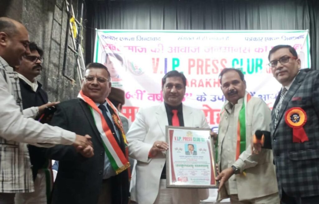 देहरादून(उत्तराखंड)।वीआईपी प्रेस क्लब द्वारा देहरादून के नगर निगम हाल में आयोजित कार्यक्रम में नगर के वरिष्ठ पत्रकार मुमताज अहमद व महताब आजाद को पत्रकारिकता में विशेष योगदान के लिए उत्षकटता सम्मान से नवाजा गया।वरिष्ठ पत्रकार मुमताज अहमद व महताब आजाद ने ये सम्मान मिलने पर वीआईपी प्रेस क्लब,देहरादून का दिल से आभार जताया और कहा कि ऐसे पुरस्कारों से और बेहतर कार्य करने की इच्छा प्रबल होती है। दोनों पत्रकारों ने इस उपलब्धि पर वरिष्ठ पत्रकार अशोक गुप्ता,विनोद निराश,आलोक तनेजा,सईद अंसारी,ओमवीर सिंह, वरिष्ठ लेखक कमल देवबंदी,समीर चौधरी,अरविंद सिंघल,दिलशाद खुशतर,डा०दिवाकर गर्ग,अनीस इंजीनियर,विजेंद्र वर्मा,मशरुर ठेकेदार,डा०शशीम देवबंदी,चौधरी ओमपाल,डा०शिबली इकबाल,डा०एसएस अजीज,तनवीर अजमल,असद सिद्दीकी,सुधीर भारद्वाज,आरिफ अंसारी,उस्मान इंजीनियर,सूरज तिवारी,आसिफ सागर, नदीम इंजीनियर,सलीम ख्वाजा,नबी हसन, व सुहेल अकलम आदि ने बधाई दी और उनके उज्जवल भविष्य की कामना की।